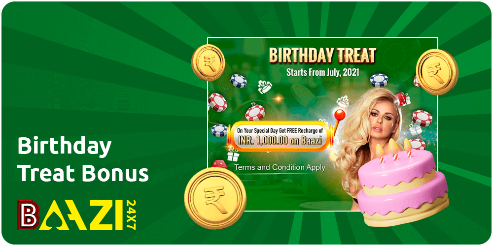 A treat for a birthday, that’s what this action is called. It is active for any player on his birthday. The user can get 1000 rupees as a reward without much effort. Important for participation in the promo is that only people who have made at least 1 deposit to their account can participate. On your birthday, a promo code will be sent, upon entering which you will receive your well-deserved rewards. Note that maximum payout of this offer is INR 1,000