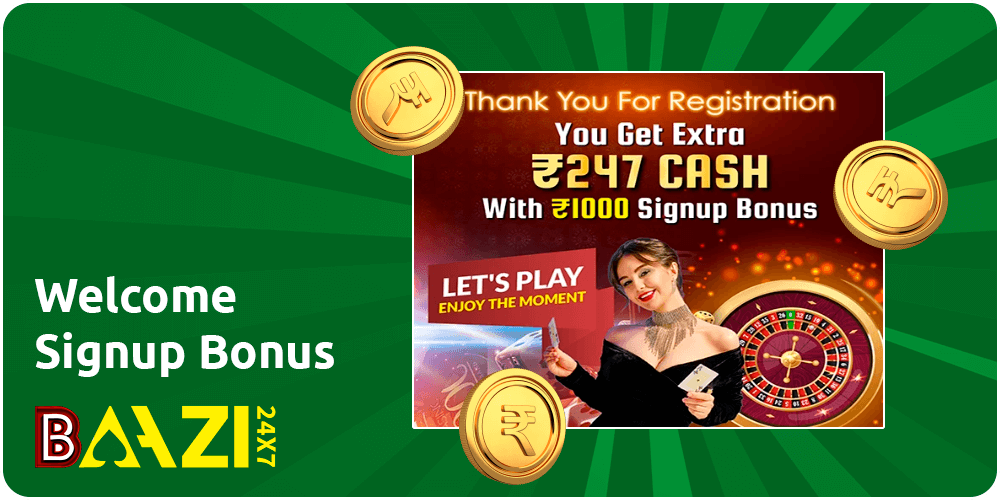 This sign-up reward on Baazi247 is a promotion for new players that offers a free credit of 1000 Indian Rupees and an extra cash of 247 Indian Rupees upon successful registration and verification. This is how you can obtain your sign-up reward: