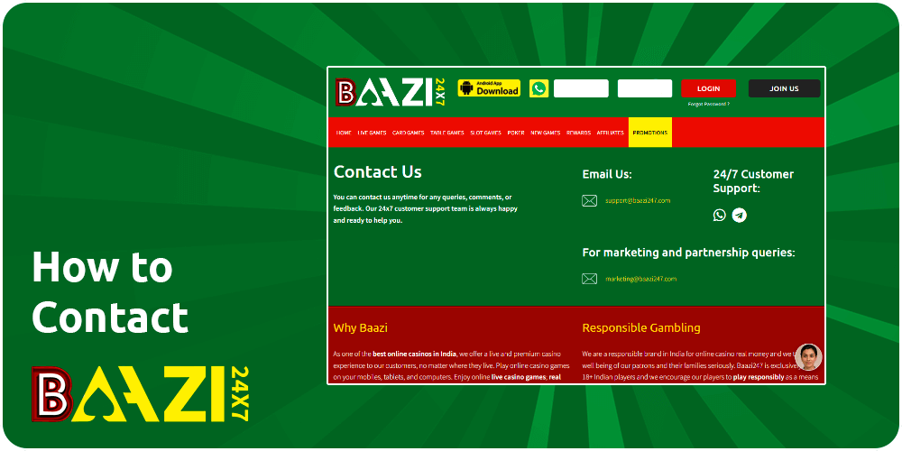 Since the Baazi247 casino official website introduces a user-friendly interface with plenty of features, it is quite easy to navigate, register, log in, make a deposit, and so on. Nevertheless, if you have any questions related to these issues, you are welcome to get in touch with our support team. Whichever method you choose for this, the specialist will respond to you immediately and offer a solution to your problem. The service operates 24/7 which implies you can send your request at any time.
